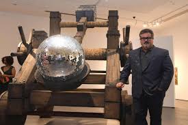 Al hablar del significado de su obra hizo una presentación gráfica con una analogía y análisis del tema migratorio. A través de la imagen de la catapulta, que es el objeto instalado que representa su obra de arte.