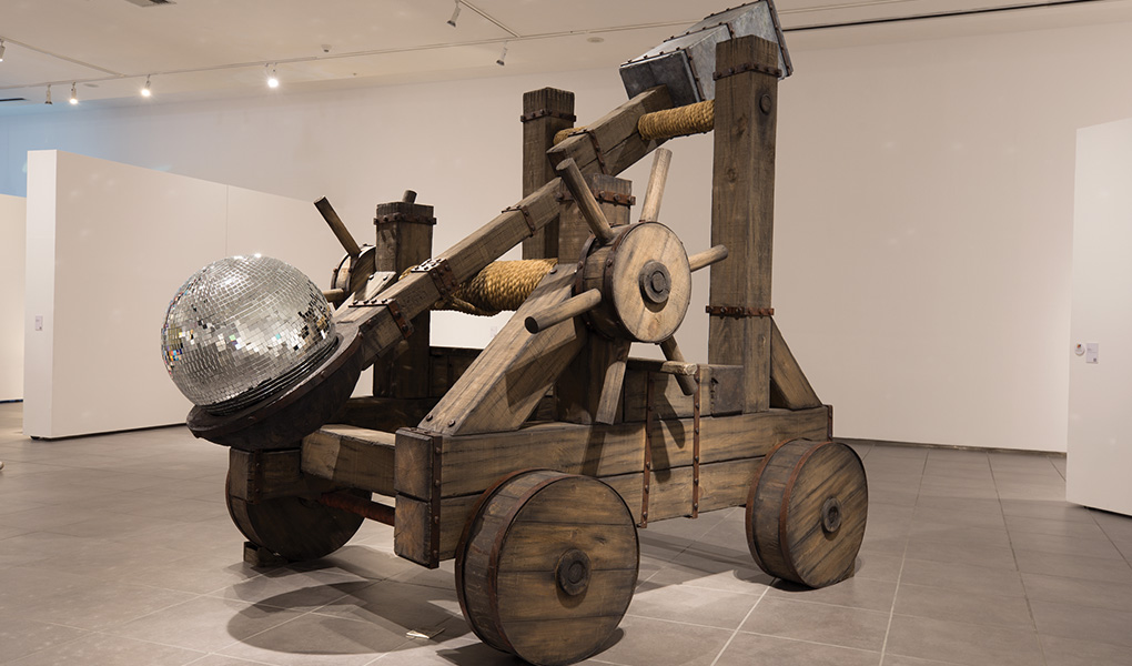 Al hablar del significado de su obra hizo una presentación gráfica con una analogía y análisis del tema migratorio. A través de la imagen de la catapulta, que es el objeto instalado que representa su obra de arte.