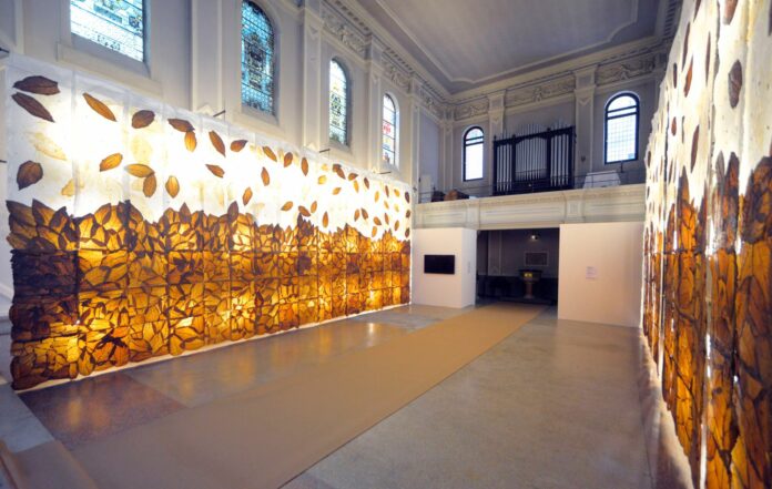 El proyecto CONEXIÓN, de la arquitecta y artista Lidia León y la curadora Roberta Semeraro, presenta una exhibición de arquitectura de interior diseñada con paneles de hojas de tabaco que cubren las paredes de la iglesia anglicana de Saint George, los cuales están iluminados por detrás para crear una traslucidez similar a la de los antiguos vitrales de la iglesia.